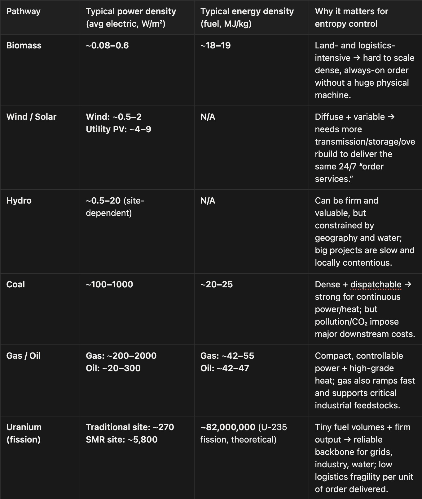 The pattern is stark: biomass, wind, and solar harvest diffuse flows, while coal, gas, and fission concentrate enormous power into relatively small footprints. Since modern life is essentially a 24/7 anti-entropy service, the systems that keep those services cheapest are usually the ones with firm output and high power density, backed by high fuel energy density.